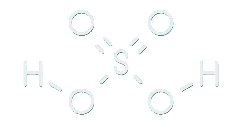 El ácido sulfúrico (H₂SO₄) es un compuesto químico altamente corrosivo, incoloro y de alta viscosidad. Es un ácido fuerte que se disocia completamente en solución acuosa, liberando iones hidrógeno y convirtiéndose en un potente agente deshidratante y oxidante. Su producción industrial se realiza principalmente por el Proceso de Contacto, en el que el dióxido de azufre (SO₂) se oxida a trióxido de azufre (SO₃) y luego se combina con agua para formar H₂SO₄.
